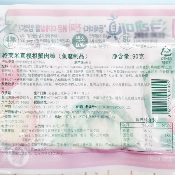 韩国特莱米真模拟蟹肉棒90g保质9个月海味零食涮火锅即食蟹味棒