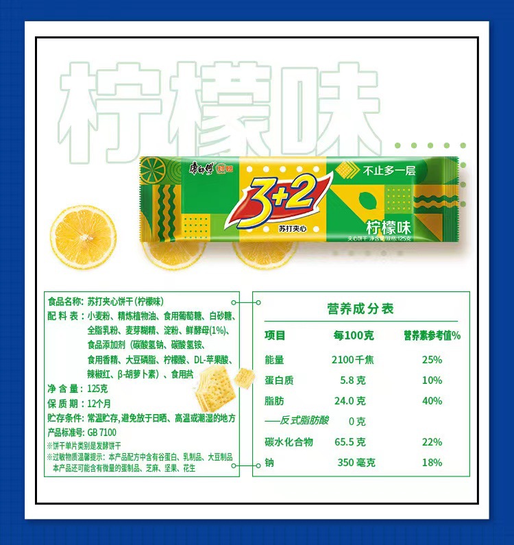 3+2苏打夹心饼干125g柠檬味