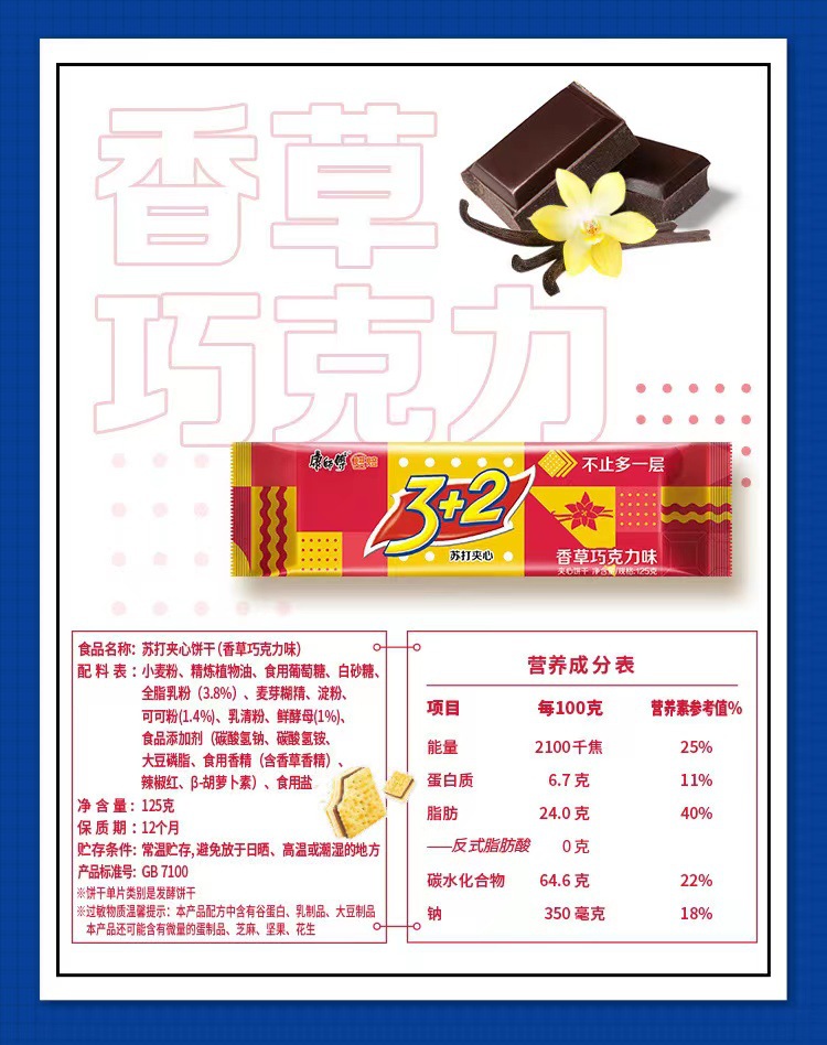 3+2苏打夹心饼干125g香草巧克力